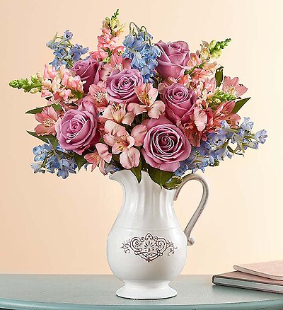 EXCLUSIVE For all she does, make this day one she’ll always remember with our gorgeous, garden-inspired arrangement. A fresh gathering of lavender roses, soft blue delphinium, pink lilies and more is artistically hand-designed inside our new and exclusive “Charlotte” vase, an antique-inspired ceramic white pitcher she can use again and again.
