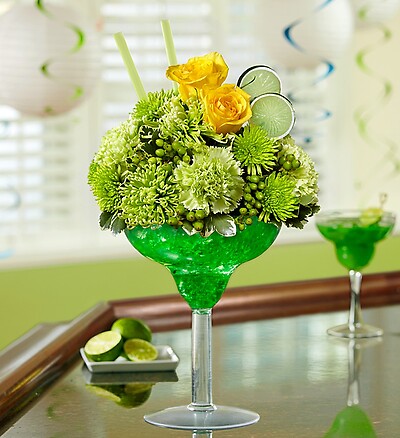 Toast that special occasion in style -- send our truly original lime margarita arrangement. Mixed with yellow roses, green carnations, green spider mums, poms and hypericum, this fresh floral cocktail is hand-arranged in an oversized acrylic margarita glass. Accented with realistic green lime slices and green straws, it's an unforgettable gift that will keep the party going.